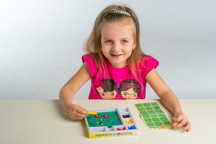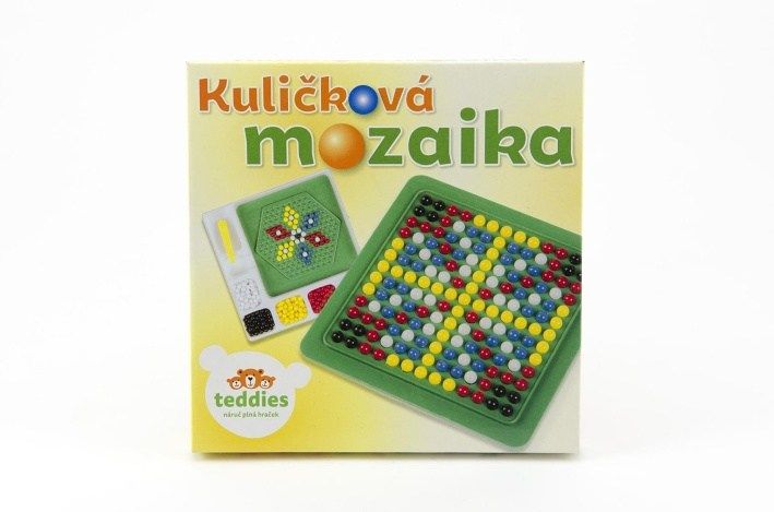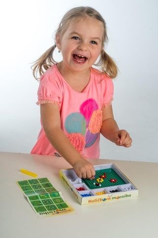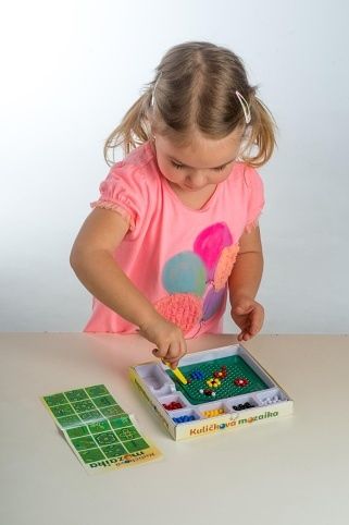 Za pomoci pinzety si děti skládají obrázky z barevných kuliček na podložku a tím si procvičují jemnou motoriku a šikovnost prstíků. Obrázky si mohou složit dle přiložených nákresů nebo dle své vlastní fantazie. Mozaika obsahuje 250 ks kuliček, pinzetu, oboustrannou destičku a papírové předlohy. Rozměr destičky: 12 x 12 cm, v krabičce.