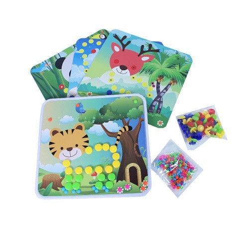 Barevná kreativní mozaika s hříbky. Sada obsahuje hříbky dvou velikostí, předlohy se zvířátky pro vytváření obrázků a podložku s dírkami pro snadnější manipulaci.