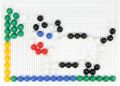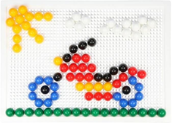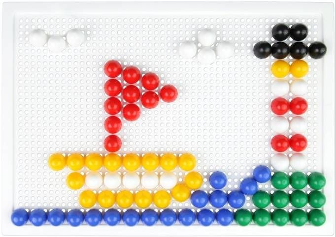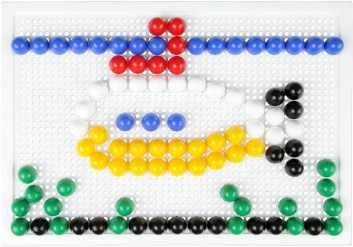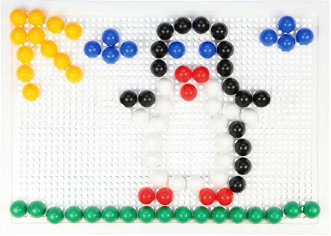 120 kusů hladkých barevných kloboučků o velikosti 15 mm balených v plátěném pytlíčku. Velikost děrované desky 28×19,5cm.