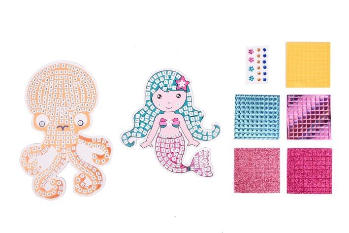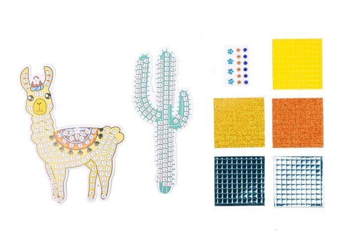 Mozaikové obrázky – lama nebo mořáská víla. Sada obsahuje obrázek s čísly + samolepky+třpytivé kamínky.