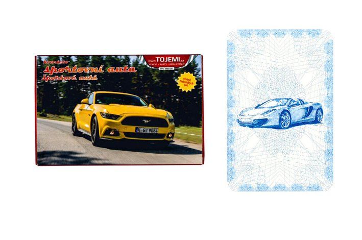 Kvarteto s motivem sportovních aut, včetně technických dat.