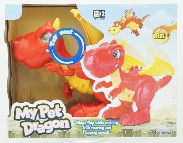 Zábavný drak, který chodí, otevírá tlamu a vydává zvuky. 2 x AAA 1,5V baterie (jsou součástí balení). 18m+ Na baterie: 2x AAA (jsou součástí balení)