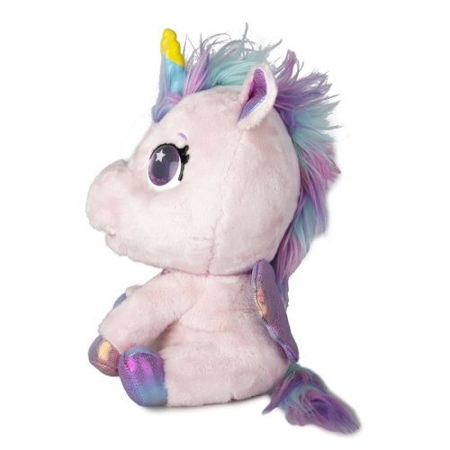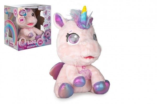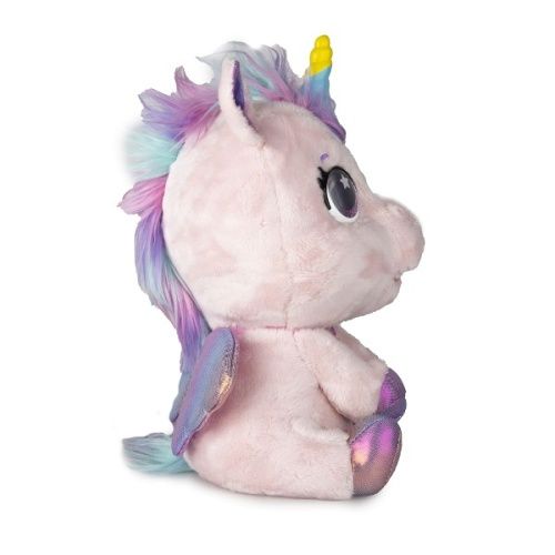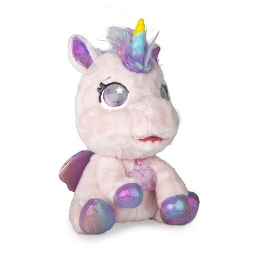Interaktivní plyšový poník, který se mění v jednorožce. Pohlaďte a nakrmte plyšového poníka, kterému postupně poroste roh (3 fáze růstu), přitom uslyšíte zábavné zvuky, abyste dokončili přeměnu v jednorožce, připněte křídla, sada obsahuje 12 doplňků (křídla, láhev, sponky, certifikát o adopci...).