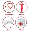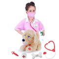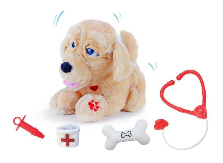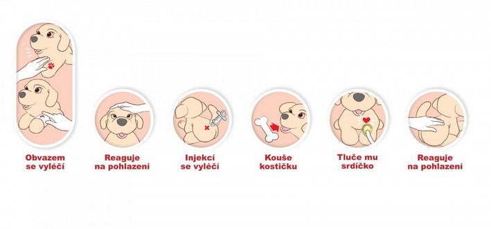 Stiskni mi tlapičku ať zjistíš, která mě bolí. Ošetři mi ji náplastí a uslyšíš, jak moc se mi ulevilo. Za pohlazení ti i radostně zaštěkám! Zatím ale nejsem úplně zdravý, potřebuji léky. Přilož injekci k mému zadečku a hned mi bude lépe. Vezmi si stetoskop a poslechni si mé srdíčko. Slyšíš, jak tluče? Haf, jsem to ale statečný pejsek! Určitě si zasloužím kostičku! Už mě nic nebolí a mám plné bříško, teď musím spát. O čempak si asi nechám zdát? Pejsek funguje díky 3 bateriím typu AA, které jsou součástí balení.