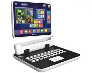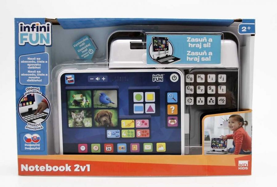 Tablet 2 v 1 může být použit samostatně, nebo s klávesnicí. Děti se pomocí otázek a úkolů učí poznávat zvířátka, barvy, číslice, písmenka, tvary a další. Obsahuje 2 AAA baterie.