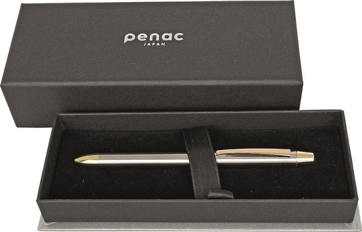 Dárkové multifunkcní pero Penac Multisync kombinuje modré a cervené kulickové pero s mikrotužkou. Elegantní pero 3v1 má štíhlé kovové telo s klasickým nadcasovým designem a lesklým stríbrným povrchem se zlatými prvky. Jednotlivé psací potreby lze snadno volit díky kvalitnímu 360° otocnému mechanismu. Dokumentní inkoust Penac Mach (dle DIN ISO 12757/2) s nízkou viskozitou zajištuje plynulé a hladké psaní. Pero obsahuje pryž bez latexu a PVC a mikrotužku s tuhou 0,5 mm. Náplne vcetne pryže jsou vymenitelné. Dodáváno v papírové dárkové krabicce. Šíre stopy kulickového pera: 0, 35 mm. Vyrobeno v Japonsku.