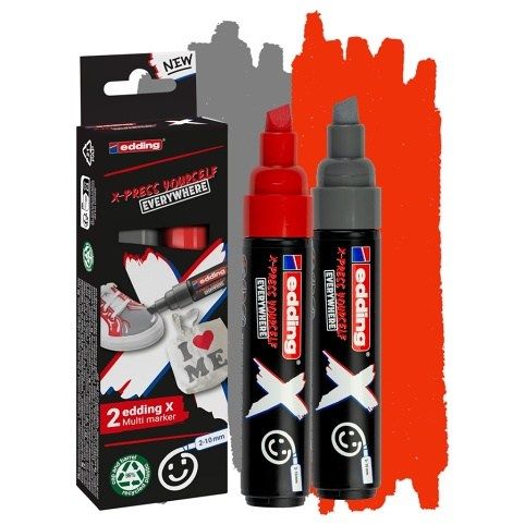 Všestranný fix edding Multimarker X je stvorený pro kreativitu všeho druhu. Je ideální pro vyjádrení vaší individuality na nejruznejších površích, proto je to univerzální parták. Zkosený hrot umožní nejen široké tahy, ale díky jeho seríznuté špicce i detailní práci. 96 % plastu použitého na vícko a telo popisovace je vyrobeno z recyklovaného (PCR) plastu získaného trídením spotrebitelského plastu. Vysoce kvalitní krycí inkoust na bázi vody je po zaschnutí permanentní, svetlostálý a bez zápachu. Pred odstranením vícka popisovac dukladne protrepejte, zapumpujte hrotem popisovace o podložku s papírem, dokud hrot dostatecne nenasákne inkoustem. Skladujte vodorovne a pri pokojové teplote. Odolný seríznutý hrot se šírkou stopy 2-10 mm je vymenitelný. Sada obsahuje tmave šedý a cervený fix. Vyrobeno v Nemecku.