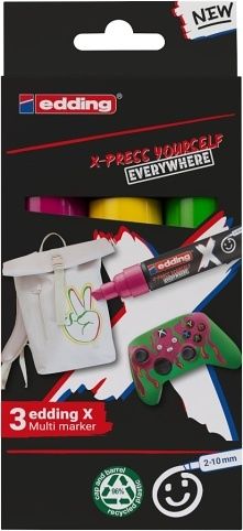Všestranný fix edding Multimarker X je stvorený pro kreativitu všeho druhu. Je ideální pro vyjádrení vaší individuality na nejruznejších površích, proto je to univerzální parták. Zkosený hrot umožní nejen široké tahy, ale díky jeho seríznuté špicce i detailní práci. 96 % plastu použitého na vícko a telo popisovace je vyrobeno z recyklovaného (PCR) plastu získaného trídením spotrebitelského plastu. Vysoce kvalitní krycí inkoust na bázi vody je po zaschnutí permanentní, svetlostálý a bez zápachu. Pred odstranením vícka popisovac dukladne protrepejte, zapumpujte hrotem popisovace o podložku s papírem, dokud hrot dostatecne nenasákne inkoustem. Skladujte vodorovne a pri pokojové teplote. Odolný seríznutý hrot se šírkou stopy 2-10 mm je vymenitelný. Sada Candy obsahuje barvy: magenta, žlutá, svetle zelená. Vyrobeno v Nemecku.