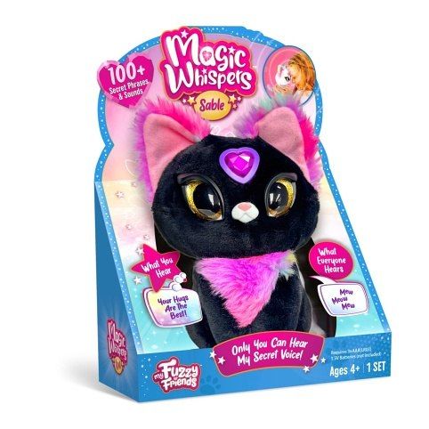Interaktivní kočička Sable ze série My Fuzzy Friends – Magická zvířátka. Každý ji slyší mňoukat a příst… když však přiložíš kočičky krystal k čelu a stiskneš, uslyšíš její tajný hlas. Jen TY porozumíš její řeči. Je to kouzlo! Kočička má 3 možnoti hraní – vtipná kočička, tajné povídání a věštba. Má více než 100 frází a zvuků. Jen ty uslyšíš tajný hlas! Výrobek vyžaduje 3× AAA baterie, nejsou součástí balení. Pro děti od 4let. Na baterie: 3x AAA (nejsou součástí balení)