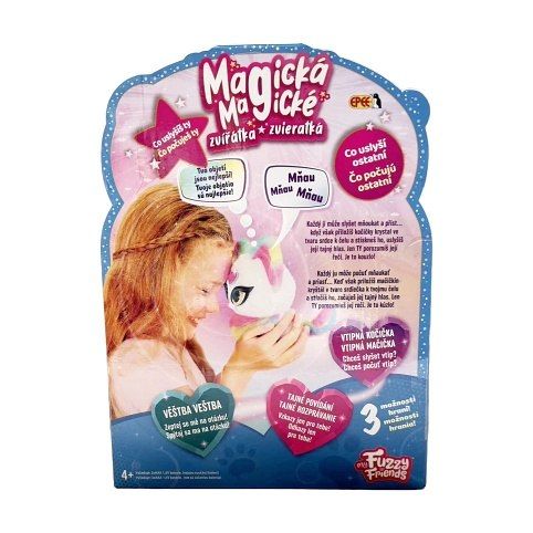 Interaktivní kočička Zoe ze série My Fuzzy Friends – Magická zvířátka. Každý ji slyší mňoukat a příst… když však přiložíš kočičky krystal k čelu a stiskneš, uslyšíš její tajný hlas. Jen TY porozumíš její řeči. Je to kouzlo! Kočička má 3 možnoti hraní – vtipná kočička, tajné povídání a věštba. Má více než 100 frází a zvuků. Jen ty uslyšíš tajný hlas! Výrobek vyžaduje 3× AAA baterie, nejsou součástí balení. Pro děti od 4let.