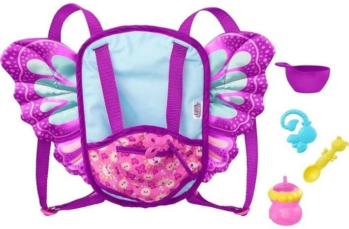 S tímto nosítkem s doplňky si mohou děti vzít My Garden Baby™ (prodává se samostatně) všude s sebou! Slouží také jako přebalovací taška a je dodáváno s lahvičkou, kousátkem, dudlíkem, hrníčkem a lžičkou. Nosítko lze nosit zepředu i zezadu, nastavitelné popruhy poskytují dětem pohodlné nošení. A co je nejlepší – měkká křídla, která děti inspirují k hraní! Děti mohou roztáhnout křídla a vzít své nosítko My Garden Baby™ všude s sebou. Nosítko je vhodné pro všechny panenky My Garden Baby™ o délce 30 cm (prodávají se samostatně). Barvy a vzhled výrobku se mohou lišit.