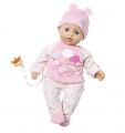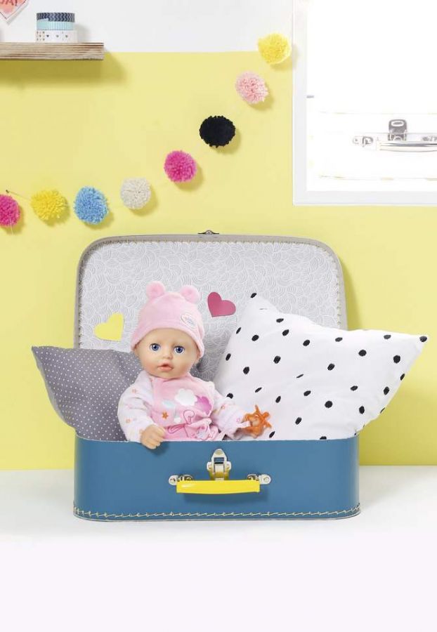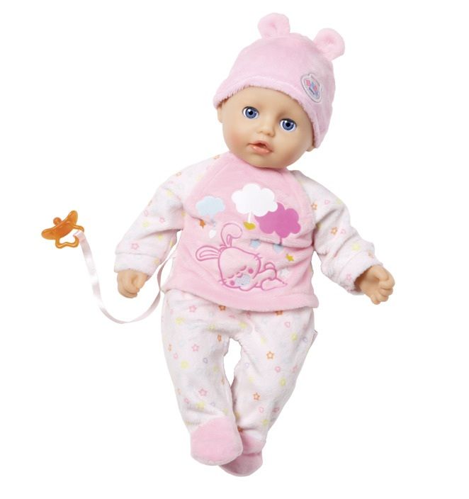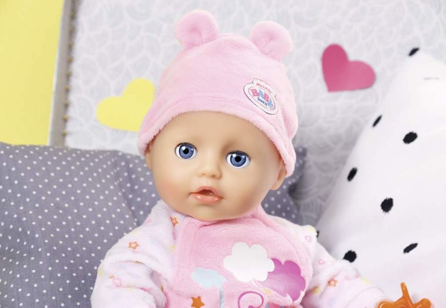 Obsah balení: panenka, dupačky, čepička, dudlík připevněný k dupačkám mašličkou.