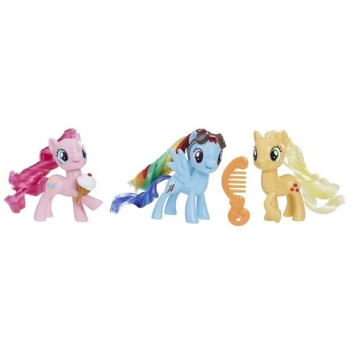 Začněte sbírat postavičky My Little Pony, abyste si mohli zahrát příběhy z kouzelné země Equestria! Tato sada 3 figurek poníků zahrnuje Rainbow Dash, Applejack a Pinkie Pie společně se 3 doplňky – vždy jeden pro každou figurku! Pročešte jejich krásné hřívy a oháňky. Každá postava poníka má svůj klasický vzhled a Cutie Mark (značku krásy) a zábavná dobrodružství mohou začít.