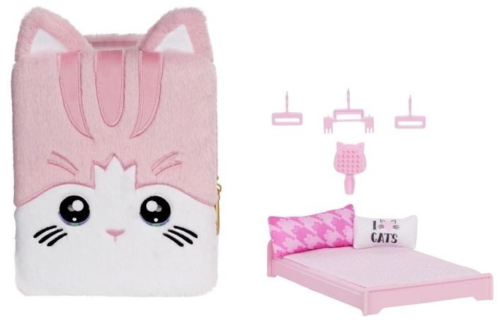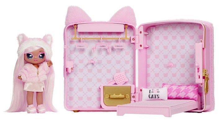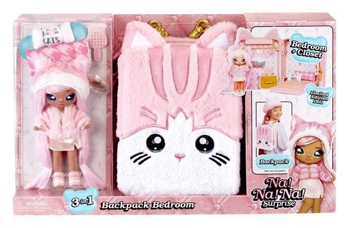 Na! Na! Na! Surprise Batoh s pokojíčkem 3v1, série 3, je hrací sada s motivem kočičky. Obsahuje módní měkký plyšový batoh, měkkou panenku s exkluzivním oblečkem a tajnou ložnici s postelí, polštářky, peřinkou, šatnou, věšáčky a velikým zrcadlem. Fialová k