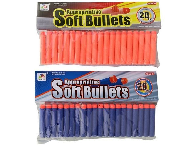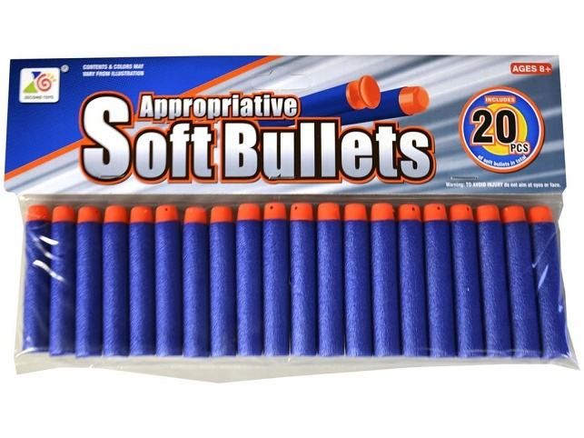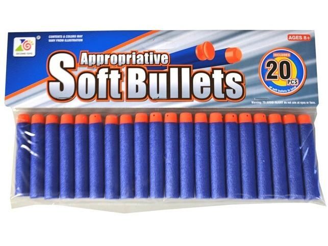 Náboje softové, 20 ks, 16 x 28 cm. Pořiďte si dostatečně velké množství softových nábojů s dostatečným předstihem. Balení obsahuje 20 kusů. Hračka je určena pro děti 8+. Rozměr hračky je 7 cm. Materiál hračky je pěna. Balení hračky je sáček s kartou. Produkt je určený pro kluky.