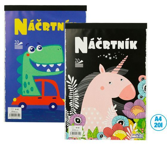 Náčrtník z náčrtníkového papíru, lepený na kratší straně, podlepený šedou lepenkou. Formát: A4 Počet listů: 20 Gramáž: 90 g