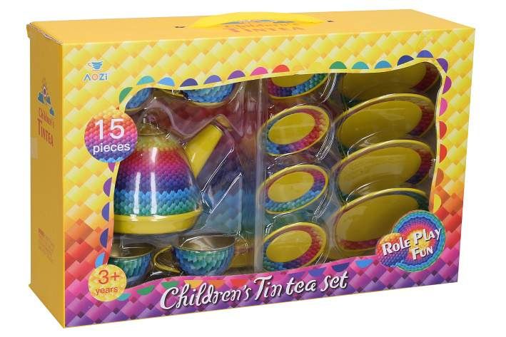 Nádobí plechové sada žlutá 15ks. Obsahuje tác 24cm, konvici 11cm, 2x hrneček 6cm, 4x talířek 5,5cm, 4x talířek 7cm.