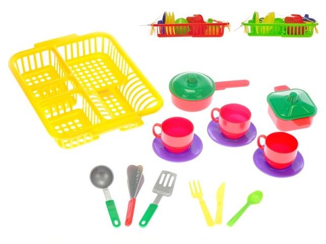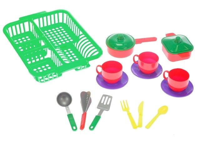 Plastové nádobí s odkapávačem pro malé hospodyňky obsahuje tři šálky s talířky, hrnec a pánvičku s pokličkami, lžičku, vidličku, nůž, odkapávač, 2 metličky a podběrnou lopatu. Věk: 3+
