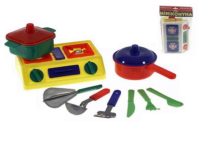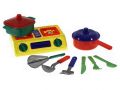 Sada nádobí z plastu pro malé kuchařky obsahuje vařič, šest kusů kuchyňského nářadí, hrnec a pánvičku s pokličkami.
