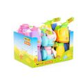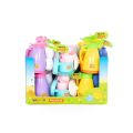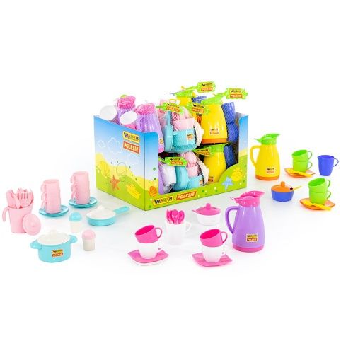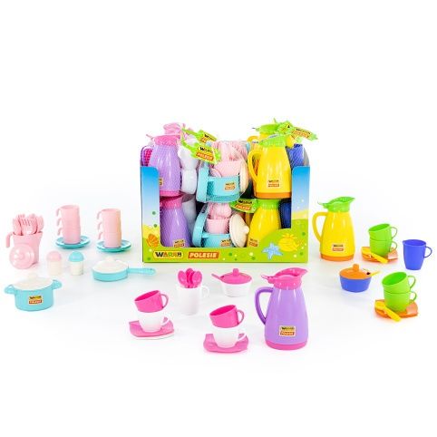 Barevný set bez konvičky: 6 hrníčků, 6 talířků, 6 lžiček, 6 vidliček a nožíků, solnička, pepřenka, hrnec s pokličkou, pánvička