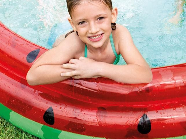 Dětský nafukovací bazén v reálných barvách melounu. Přibližná velikost 168 × 38 cm. Opravná záplata součástí balení. Bazén je vyroben z kvalitního PVC materiálu a tvoří 3 vzduchové komory. Pozvi své kamarády na zahradu a dopřejte si to pravé ledové osvěžení!