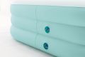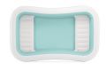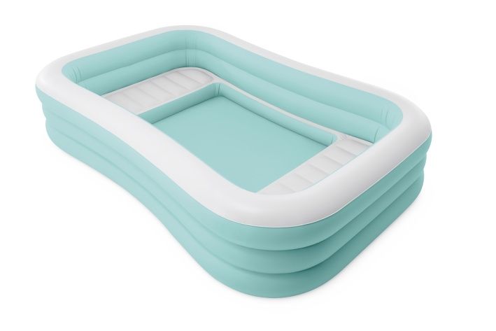 Nafukovací bazén Swim Center™ Family Lounge je navržen pro pohodlný rodinný odpočinek a zábavu ve venkovním prostředí. Bazén má obdélníkový tvar s mírně zaoblenými rohy a je vyroben z pevného, hladkého PVC materiálu v kombinaci světle modré a bílé barvy, což mu dodává svěží a příjemný vzhled. Jeho konstrukce je tvořena třemi nafukovacími kruhy, které zajišťují stabilitu a dostatečnou výšku stěn bazénu. Jednou z hlavních předností tohoto modelu jsou zabudovaná nafukovací sedadla umístěná po obou kratších stranách bazénu. Tato sedadla jsou bílé barvy a jsou navržena tak, aby poskytovala pohodlné posezení a zároveň mírně oddělovala plochu pro koupání od prostoru k sezení, což zvyšuje komfort uživatelů. Nafukovací dno bazénu je ploché a sjednocené s vnitřní barvou bazénu, což umožňuje bezpečné a příjemné stání i sezení ve vodě. Bazén je vybaven praktickým vypouštěcím ventilem, který je snadno přístupný zevnitř i zvenčí, což usnadňuje jeho rychlé vypuštění a údržbu vody. Ventily jsou modré barvy a dobře zapadají do celkového designu, zároveň jsou navrženy tak, aby minimalizovaly únik vzduchu. Díky své velikosti a konstrukci je bazén vhodný pro děti od 6 let a také pro dospělé, kteří chtějí relaxovat při společném koupání. Tento nafukovací bazén je ideální volbou pro letní chvíle na zahradě či terase, kdy poskytuje příjemné osvěžení a zároveň pohodlné posezení přímo ve vodě. Jeho jednoduché nafukování a vypouštění zajišťuje rychlou přípravu a snadnou manipulaci, což ocení především rodiny s dětmi a milovníci letních vodních her.