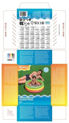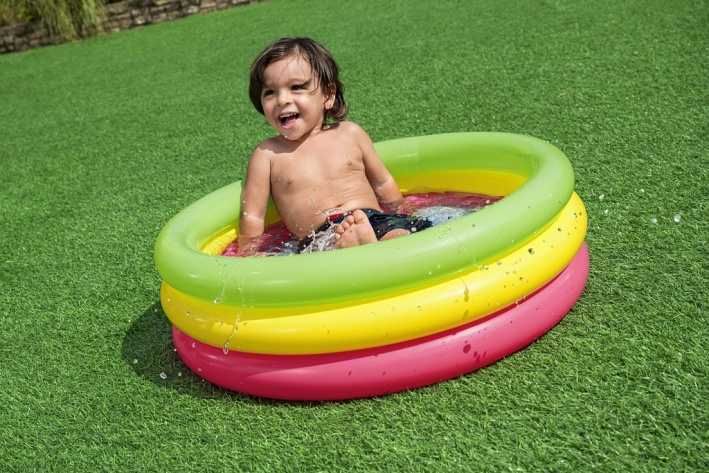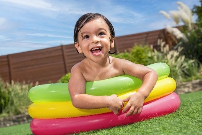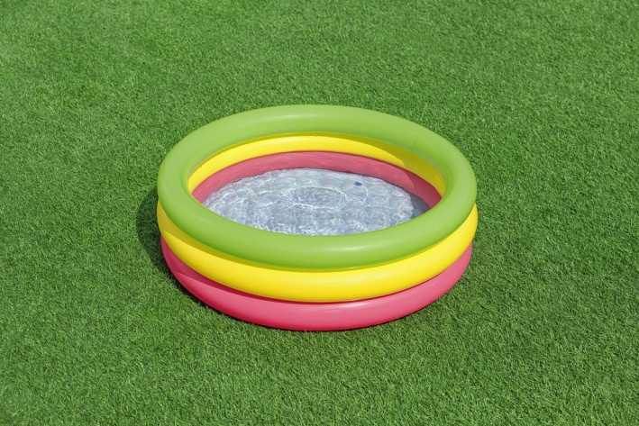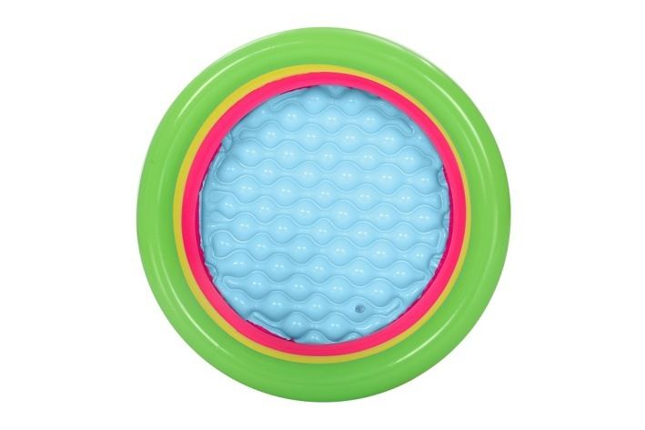 Nafukovací bazének tří kruhový pro nejmenší děti od 2 let. Veselý barevný design. Velikost bazénku je přibližně 70×24 cm, nafukovací podlážka pro komfort dětí. Vyrobeno z testovaného masivního vinylu. Součástí balení je opravná záplata.