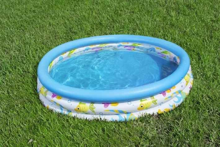 Nafukovací bazének tří kruhový pro nejmenší děti od 2 let. Veselý barevný design. Velikost bazénku je přibližně 122×25 cm. Vyrobeno z testovaného masivního vinylu. Součástí balení je opravná záplata.