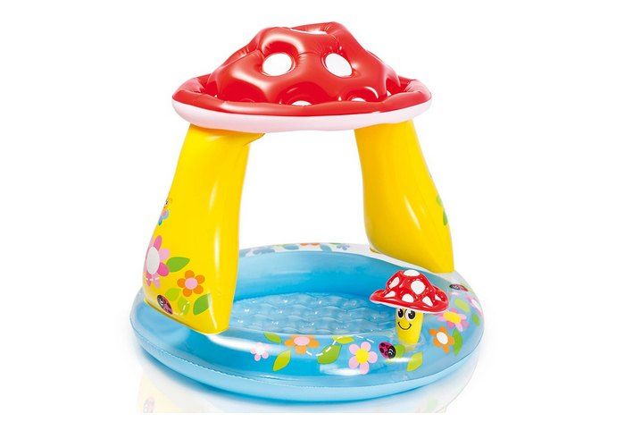 Nafukovací dětský bazének se stříškou ve tvaru muchomůrky. Stříška chrání dítě před slunečními paprsky. Bazének je vybaven nafukovací muchomůrkou.