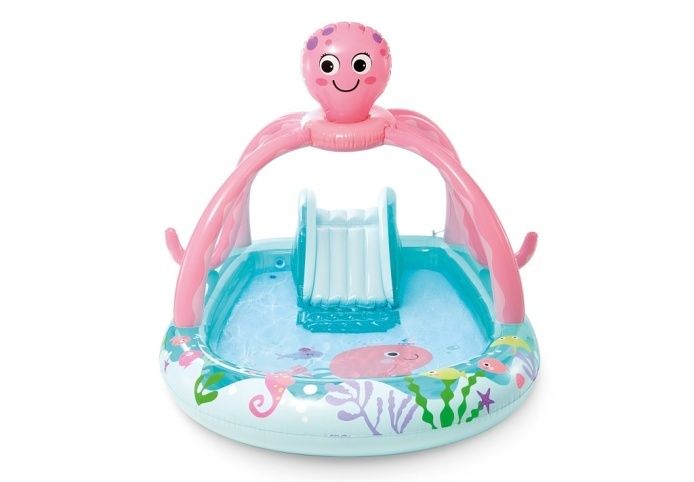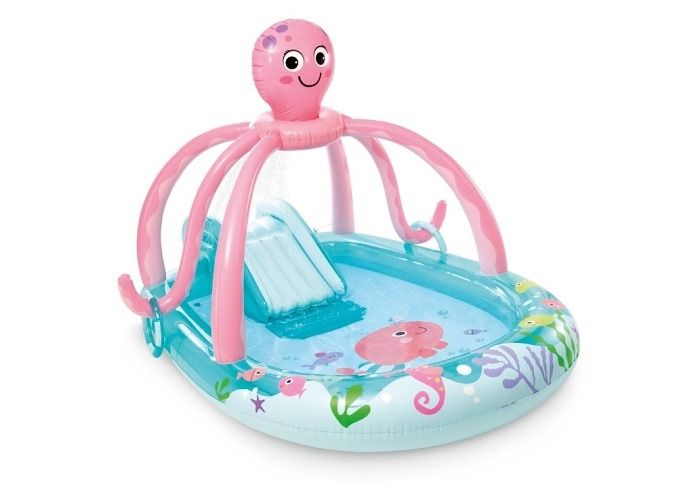 Hrací centrum o velikosti 234×183×150cm. Zabudovaná sprška s připojením na zahradní hadici. Součástí balení jsou dva nafukovací kroužky a opravná záplata. Extra nafukovací podlážka pro větší pohodlí. Maximální nosnost je 54 kg. Objem je maximálně 229 l.