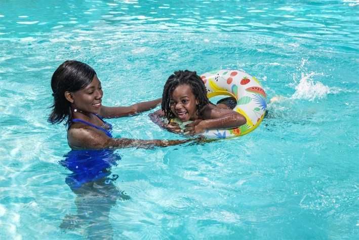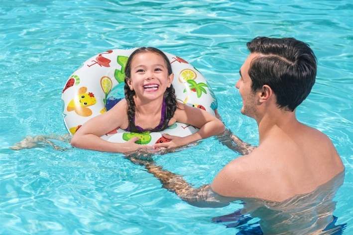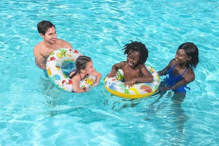 Nafukovací kruh o průměru 61 cm je vyroben z pevného a odolného vinylového materiálu. Kruh je k dispozici ve dvou veselých designech – tropické ovoce nebo plameňáci s kaktusy. Maximální nosnost je 60 kg.