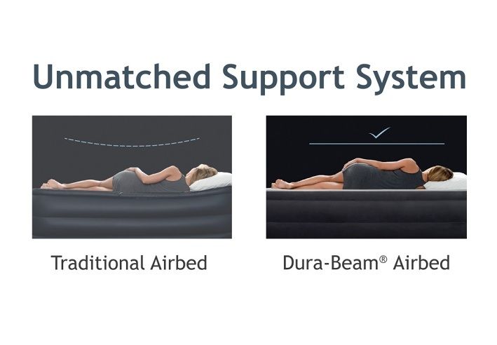 Nafukovací postel o velikosti 1,37 m x 1,91 m x 33 cm. Lehátko je