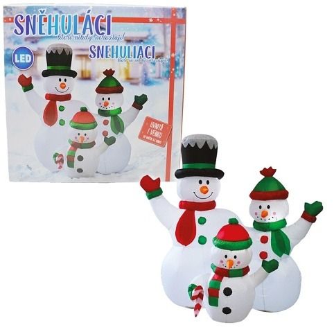Nafukovací svítící rodina sněhuláků s LED Popis produktu: Dekorativní nafukovací sněhuláci s LED osvětlením Rozměry po nafouknutí: 160 × 93 × 153 cm Vhodné pro interiér i exteriér Design: rodina sněhuláků Obsah balení: Nafukovací sněhuláci s LED pásky Kompresor (12V, 0,8A) Adaptér (12Vdc GS/IP44 1,0A) Přívodní kabel 2m 4× kotvící kolíky 2× upevňovací lana Český návod k použití Důležitá upozornění: Nejedná se o hračku Určeno pouze pro dekorativní účely Nutná pravidelná údržba Údržba: Čistit pouze navlhčeným hadříkem Pravidelně kontrolovat stav produktu Zajistit správné ukotvení při venkovním použití Likvidace: Produkt nepatří do běžného komunálního odpadu Nutno odevzdat na místa zpětného odběru elektrozařízení Seznam sběrných míst na ="http://www.asekol.cz">www.asekol.cz a ="http://www.ekobat.cz">www.ekobat.cz Bezpečnostní pokyny: Instalaci provádět dle přiloženého návodu Zajistit správné elektrické připojení Při venkovním použití řádně ukotvit Chránit před extrémními povětrnostními podmínk
