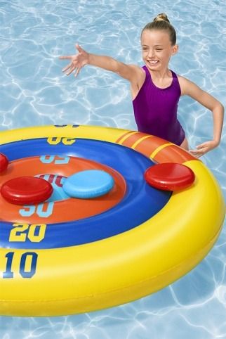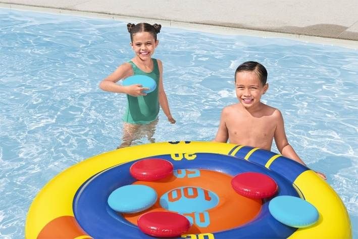 Nafukovací terč je dokonalou venkovní zábavou pro celou rodinu. Frisbee v různých barvách, které jsou součástí sady, poslouží k soutěži v týmech. Hra trénuje přesnost a koordinaci ruka-oko. Hra poskytne spoustu zábavy nejen dětem, ale i dospělým. Vyrobeno z odolného materiálu, opravná záplata součástí balení.
