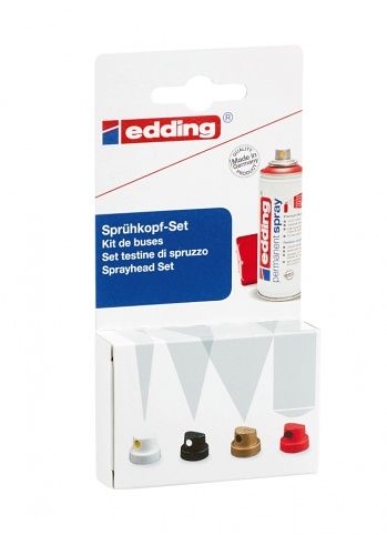 Sada rozprašovačů na akrylové barvy edding 5200 pro malování tenkých linií či velkých ploch. Použití: bílá hlavice pro tenkou stopu 1 cm, černá hlavice pro střední stopu 4–5 cm, zlatá hlavice pro širokou stopu 8–10 cm. Červená hlavice se stopou 13–14 cm je určená pro velké plochy, šířka stopy může být variabilní dle náklonu spreje (podobně jako při práci se stříkací pistolí). Balení obsahuje: 2 ks bílé, 2 ks černé, 1 ks zlaté a 1 ks červené hlavice. Vyrobeno v Německu.