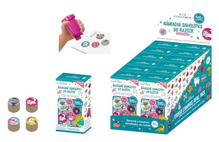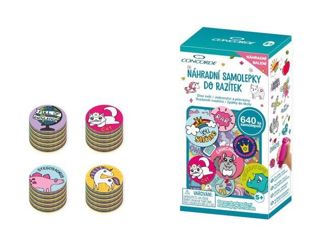 Náhradní balení samolepek do razítek obsahuje 640 ks samolepek s pestrou nabídkou motivu, jako jsou roztomilí mazlícci, jednorožci a princezny, dino svet a zpátky do školy. Razítko není soucástí balení. Popustte uzdu své kreativite a vytvorte originální obrázky s temito samolepkami. Mužete jimi ozdobit školní sešity, pozvánky, stul nebo pokoj – možnosti jsou témer nekonecné. Samolepky snadno prilnou k hladkým povrchum, jednoduše se sloupnou a lze je opakovane použít. Objevte radost z tvorení s našimi barevnými samolepkami!