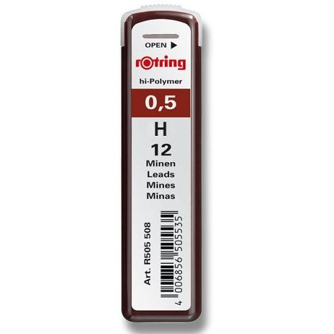 Tuhy Rotring s vysokým obsahem polymerů jsou díky speciálnímu složení extra pevné. Krabička obsahuje 12 ks tuh.Různá šířka a tvrdost tuhy.