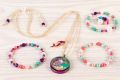 Náhrdelník a náramky, medailonek. Obsahuje: kovový medailon, 60 zlatých korálků, 50 plastových korálků, 45 plastových perel, 30 miniaturních perel a korálků, průhlednou elastickou šňůru (1m).