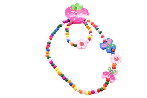 Sada doplňků pro malé parádnice se motýlky. Sada obsahuje náhrdelník a náramek z dřevěných korálků. Korálky jsou navléknuté na pružné gumičce, čili jsou přizpůsobivé. Velikost náhrdelníku 2x20 cm, velikost náramku 2x6 cm (měřeno bez natažení). Baleno v sáčku. Výrobek není hračka.