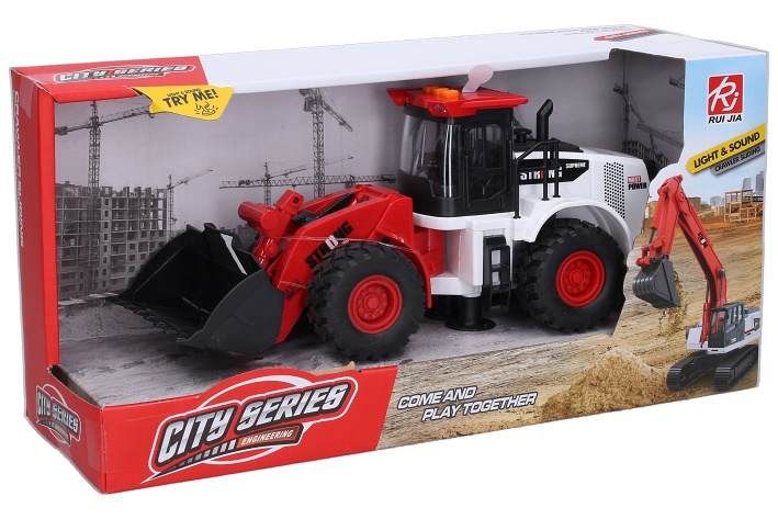 Nakladač s efekty na setrvačník. Velikost 30 cm. Vydává světelné a zvukové efekty. Aktivace tlačítky na střeše. Zvuky couvání, troubení, startování motoru, pohyby nakladače. 3xAG13 baterie, součástí balení.