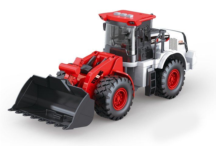 Nakladač s efekty na setrvačník. Velikost 30 cm. Vydává světelné a zvukové efekty. Aktivace tlačítky na střeše. Zvuky couvání, troubení, startování motoru, pohyby nakladače. 3xAG13 baterie, součástí balení.