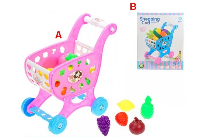 Dětský plastový nákupní vozík s ovocem a zeleninou.