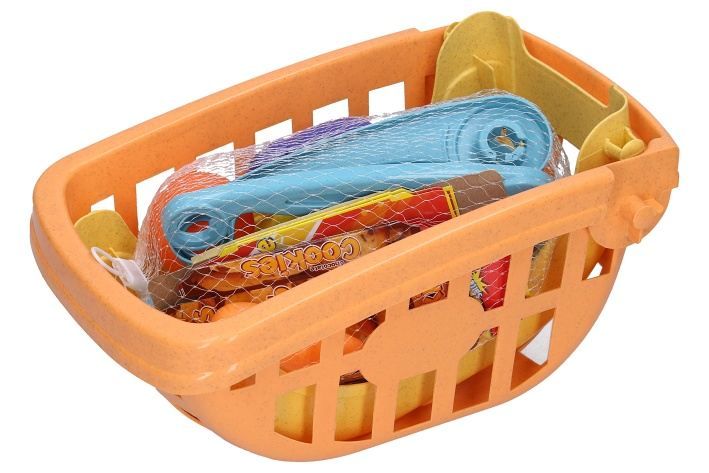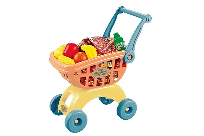 Nákupní vozík s potravinami Bioplastic. Obsah balení - nákupní vozík, ovoce, zelenina, džus, brambůrky, cookies. Velikost 41,5 cm.