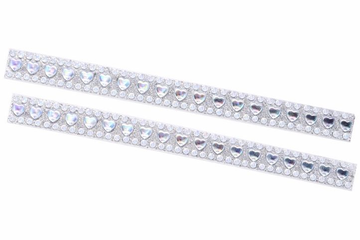 Luxusní samolepicí pás zdobený irizujícími kamínky ve tvaru srdce dodá vašim dekoracím romantický a elegantní vzhled. Kombinace větších srdíčkových kamenů s duhovým efektem a drobných čirých kamínků vytváří výrazný třpyt, který krásně odráží světlo.