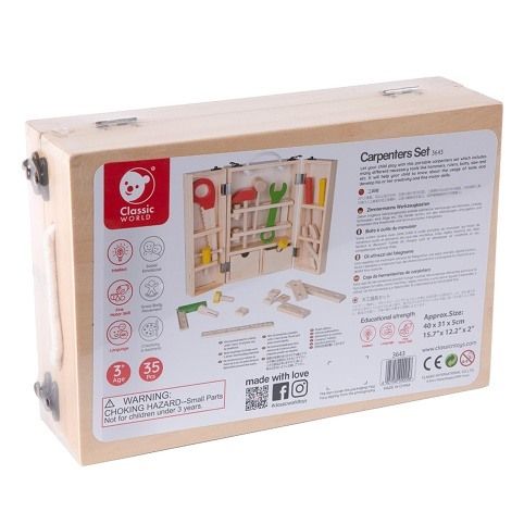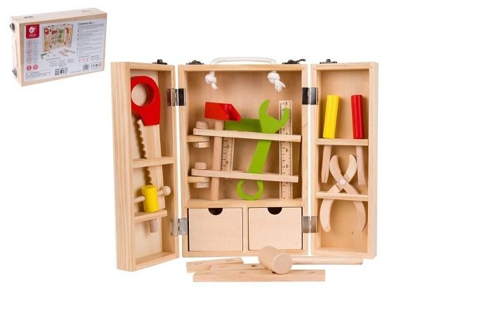 " V sadě dřevěného nářadí se nachází:- sada šroubků, matky, hmoždinky, lišty s otvory k montáži, 2 klíče, šroubováky, kladívka, pravítka a pilka. Dítě může libovolně přikrucovat lišty s pomocí klíče a šroubováku. Všechny díly může spolu spojovat pomocí šroubků.