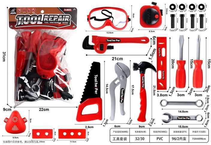 Nářadí set. Součástí ochranné brýle, svinovací metr, 4 šrouby, 4 matice, hasák, pilka, kleště, kladívko, vodováha, 2 šroubováky, 2 klíče, 2 dřívka, maska.