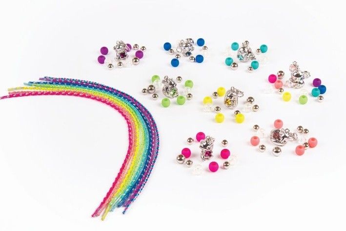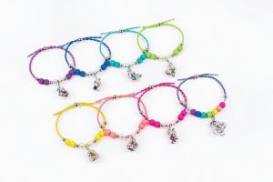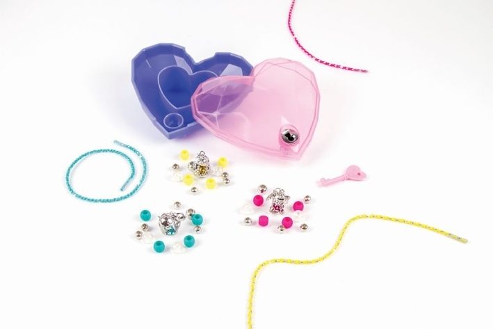 Balení obsahuje 3 náramky s přívěsky a krystalem SWAROVSKI, krabičku ve tvaru srdce, klíček, korálky, barevné šňůry a instrukce Vhodné od 8 let.