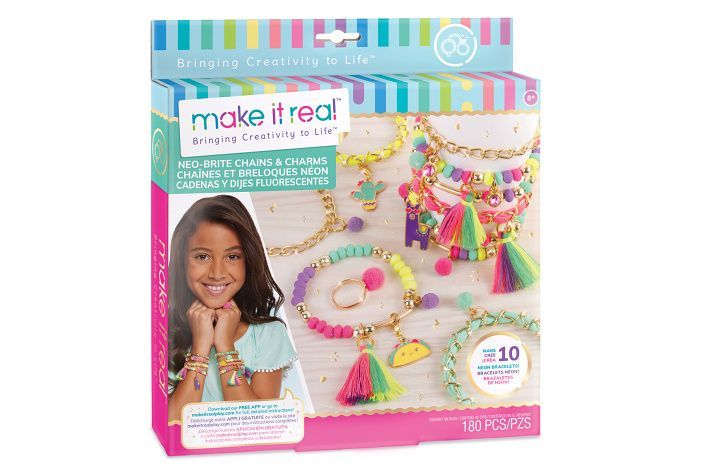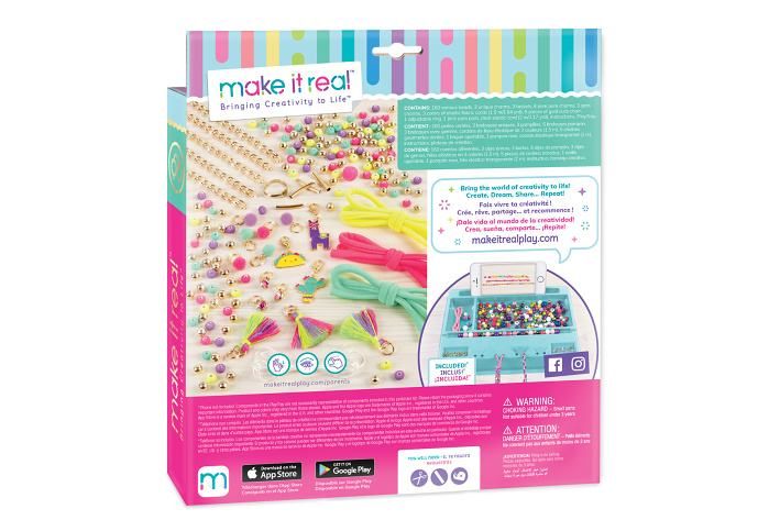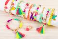 Náramky se střapci a prstýnek. Obsahuje: 160 různých perlí, 13 přívěsků, 3 střapce, 3 barvy elastických textilních šňůr (1,5 m), 5 ks zlatých řetízků, 1 nastavitelný kroužek, průsvitná elastická šňůra (2 m), instrukce.