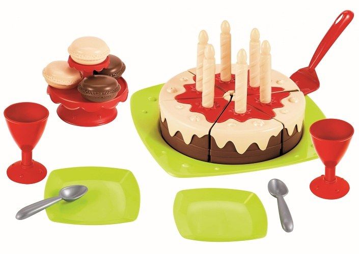 Vše potřebné pro oslavu narozenin. Dort rozdělený na 6 částí, 6 svíček, 2 talířky, 2 lžičky, 2 pohárky a miska se 4 makronkami. Včetně podnosu a servírovací lžíce.