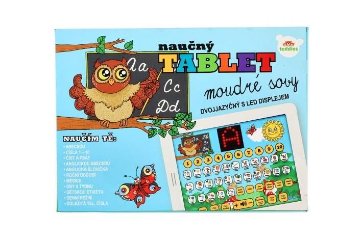 Naučný tablet moudré sovy dvojjazyčný CZ+AJ plast 24x19x2cm na baterie se zvukem v krabici